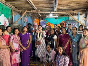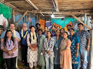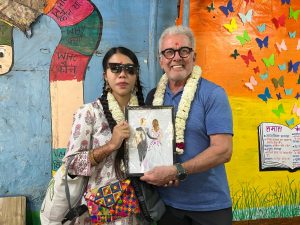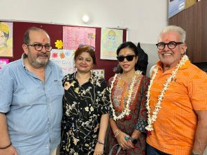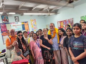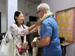 Serge carries India in his heart and his bride has never visited India. It was decided to welcome them at every centre with traditional Indian marriage customs. There was the exchange of garlands, the bride entering the ‘house’. after kicking a pot of rice, games newly weds play when the pride first comes, traditional wedding songs, wearing of toe rings and more.