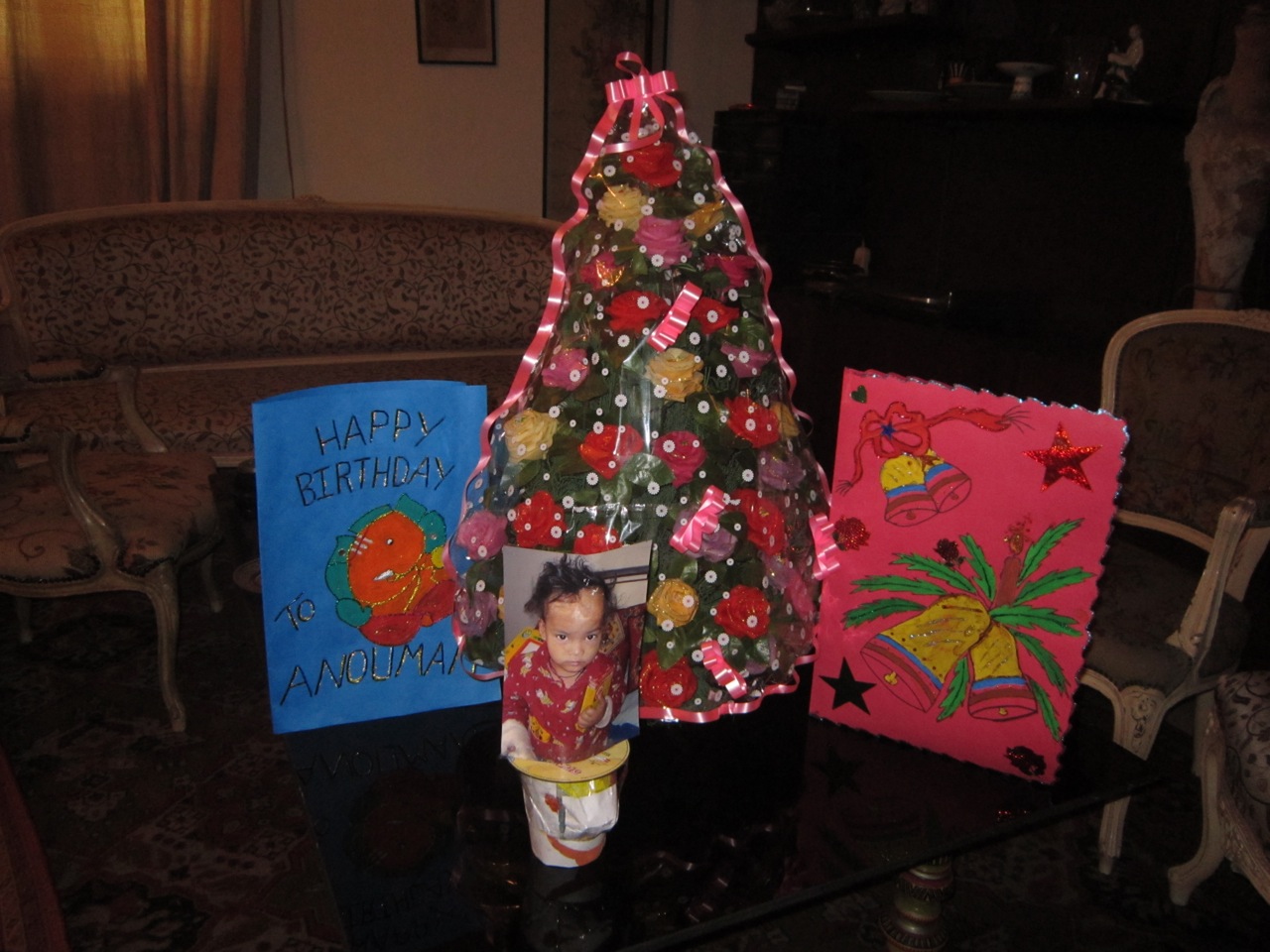 Then it was party time. And what a party! It began with a visit of the office where the staff had decided to celebrate big: balloons (yes for the old biddy) and streamers and when I sat on my chair and the fan was switched on petals fell on me. Wow I had never been showered with flowers. Then a cake, home made and delicious and my first set of gifts. Before I go on I would like a little aside to unravel the mystery of the picture you see on this blog. These are my most precious gifts. In front you can see a strange contraption with an old picture of Utpal. Well that is gift that Utpal made for me before he left for school. Utpal loves makings things from anything he finds so this is an assembly of an old CD, some thermacol box, a lot of glitter and an old picture of his. It is a pure marvel as he spent hours finding things, putting them together, breaking and remaking it till he was satisfied. And then before he left he brought it to my office and gave it to me with a huge hug. Needless to say it occupies centerstage in my office. The bouquet is not one bought from a flower vendor. It is the gift from the Okhla kids and each flower has been painstakingly hand made. I do not know how long it took, but I am overwhelmed by the gesture. The cards are precious too: one was made by the special kids and everyone of them signed it and the other by the tiny tots of the creche.